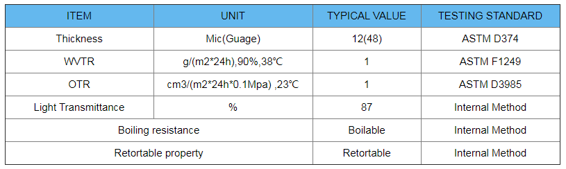 Film Pet Film potiahnutý ALOX dosahuje dolnú bariérovú vlastnosť ako hliníková fólia ukladaním tesnej molekulárnej vrstvy ALOX na film substrátu PET. V súčasnosti je lepšia bariérová vlastnosť spoločnosti Changyu schopná získať hodnotu OTR a hodnotu WVTR pod 1.0, s podrobnými informáciami uvedenými nižšie.